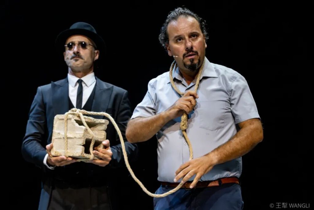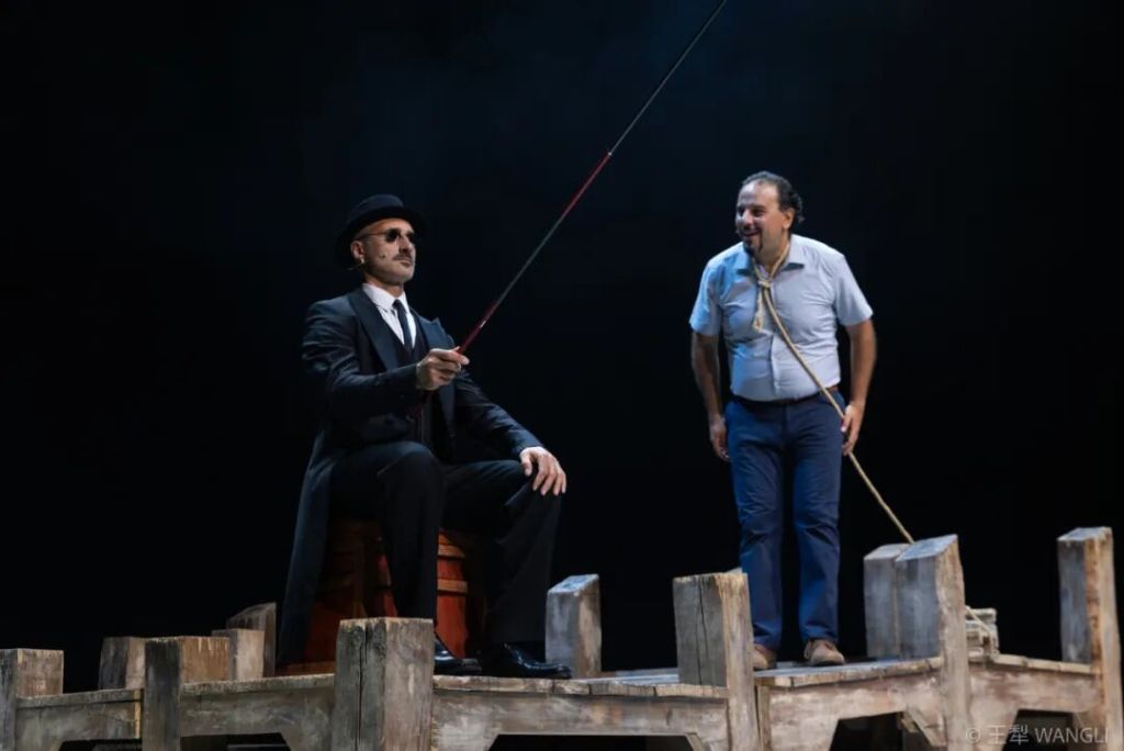 他们没有采用传统荒诞剧中那种机械、疏离的肢体,而是都将角色的矛盾全部内化于充满讽刺调侃且生活化的表演细节之中。男人的懦弱与挣扎,死神的超然与冷漠,都在一种以闹剧传统为基底的表演里,死神(垂钓者)优雅地玩弄无绳钓竿,男人模仿猎狗时夸张且自然,让观众在笑声中直面存在哲学的思考深渊。