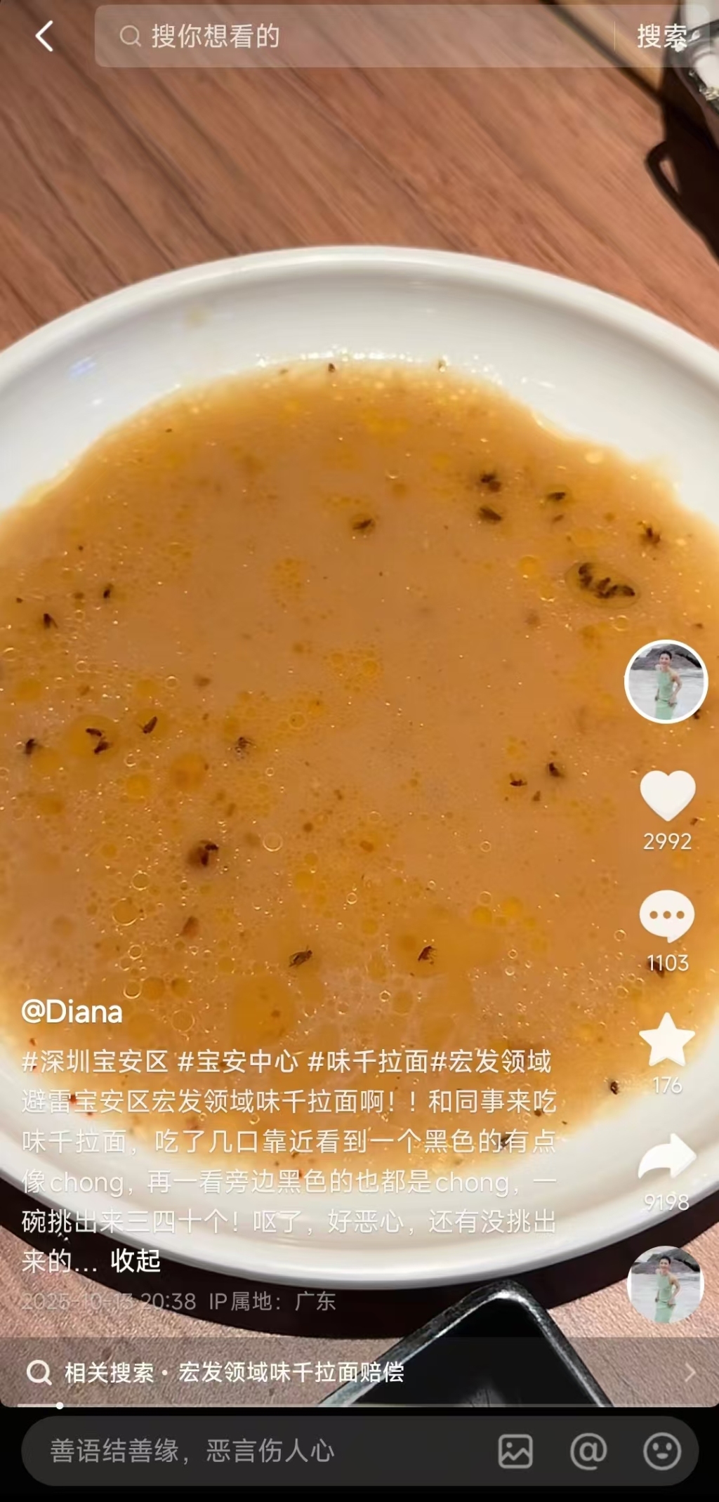 味千拉面碗里漂着很多黑色小虫子?深圳宝安区市监局:跟进调查处理