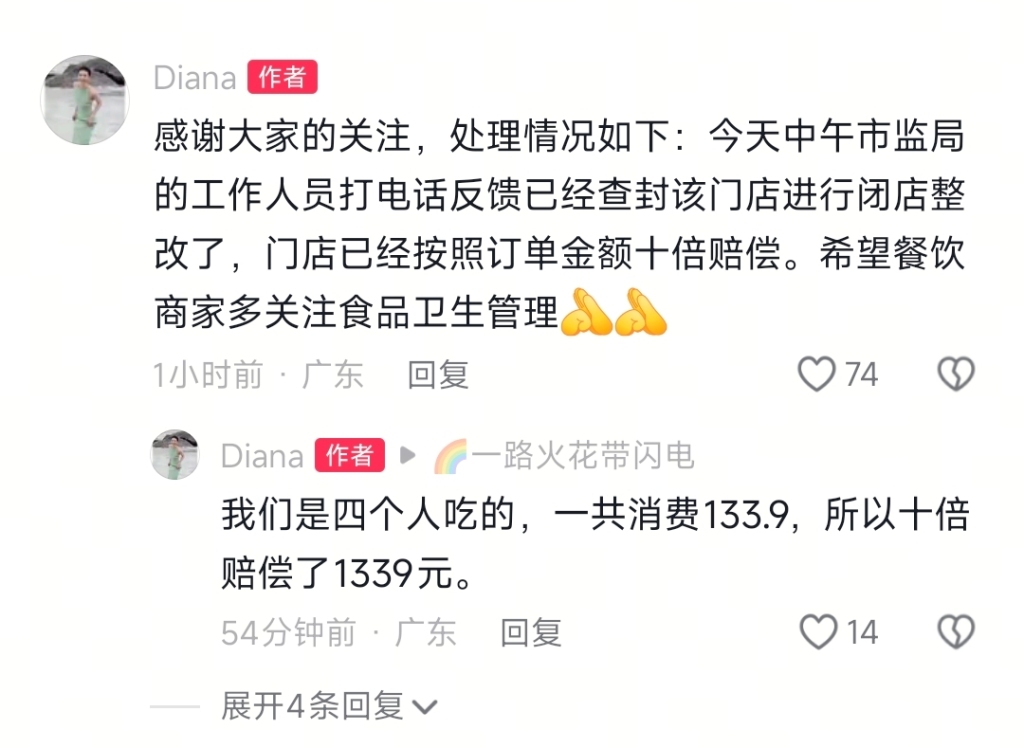 10月14日中午,上述用户在视频的评论区留言称,14日中午,“市监局的工作人员打电话反馈已经查封该门店进行闭店整改了,门店已经按照订单金额十倍赔偿。希望餐饮商家多关注食品卫生管理”。其在留言区还透露,当时是四个人一起吃饭,“一共消费133.9,十倍赔偿了1339元”。