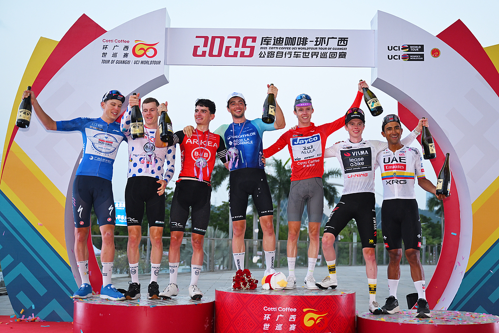 随着南宁城市赛段尘埃落定:杰科-埃尔奥拉车队的保罗·达博凭借在弄拉皇后赛段的卓越表现,最终夺得象征总成绩冠军的红色领骑衫;豪取五胜的速的奥-快步车队的马尼耶凭借绝对的冲刺能力捍卫了象征冲刺王的蓝色领骑衫;阿尔凯亚-B&B酒店车队的西蒙·居列尔米获得象征爬坡王的圆点衫;维斯玛车队的约尔根·诺德哈根则夺得象征青年最佳的白色领骑衫;维斯玛-丽思拜克车队收获最佳车队荣誉。此外,迪卡侬AG2R车队的维克托·拉菲和阿联酋航空-XRG车队的约纳坦·纳瓦埃兹分获总成绩二、三名。