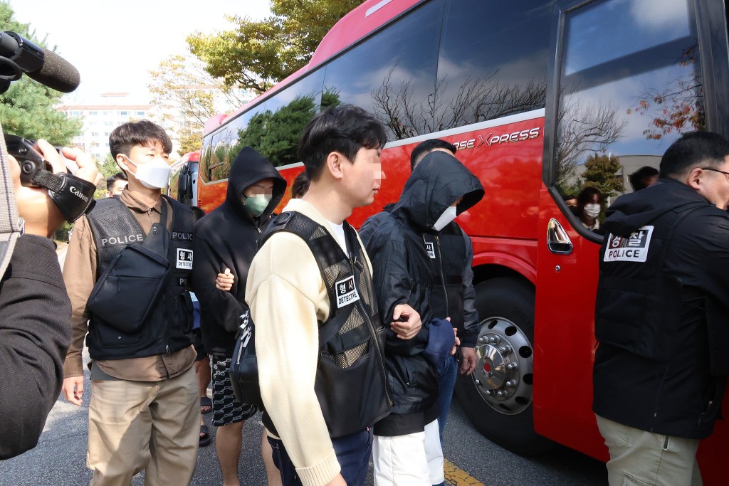 当地时间2025年10月20日,韩国忠清南道洪城,涉嫌诈骗的柬埔寨遣返嫌疑人抵达大田地方法院洪城分院,接受逮捕令实质审查。视觉中国 图