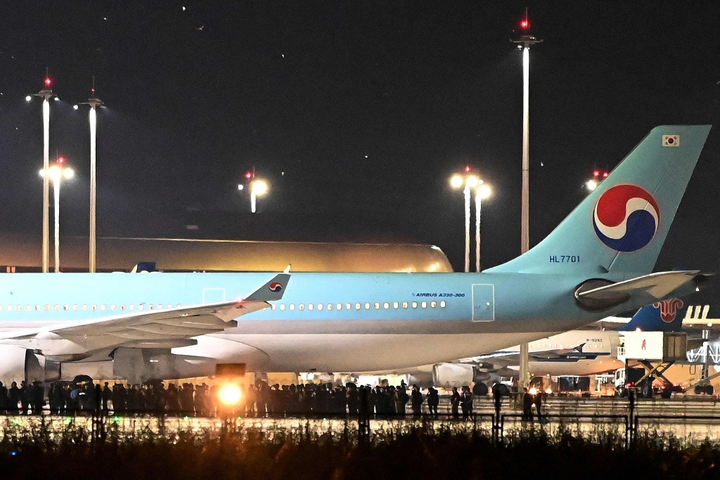 当地时间2025年10月18日凌晨,在柬埔寨金边德崇国际机场,警察押送被遣返的韩国网络诈骗嫌疑人登机。新华社 图