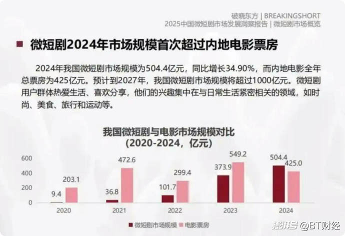正如周鸿祎所说,十亿人离不开短视频,短剧的受众人数可想而知。2024年中国短剧市场规模达505亿元,首超电影票房,预计2027年将突破856亿。短剧成为资本的新宠儿。
