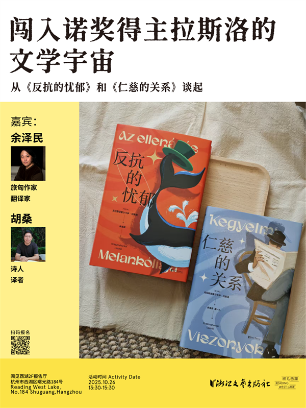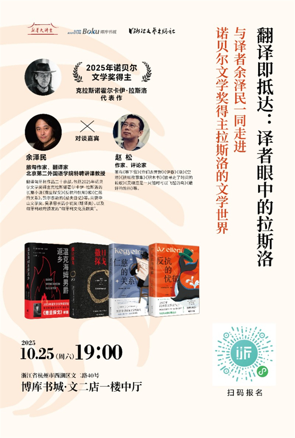 2025年诺贝尔文学奖授予匈牙利作家克拉斯诺霍尔卡伊·拉斯洛。与此同时,他的中文译者余泽民也因传奇的人生经历、幽默真切的译者心境迅速走入了公众视野。余泽民不仅是拉斯洛的中文译者,更是他三十年的挚友。10月24日晚,余泽民将做客浙江大学惟学文化大讲堂,分享他与拉斯洛的三十年文学对话,带领我们走进拉斯洛艰涩而神秘的文学世界。