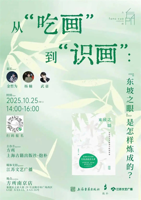 我们所熟知的苏轼,是文学家、书法家,但他留下的一段段论画金句,也向我们展示了他极大的阅画量和由此炼就的“识画之眼”。“东坡之眼”究竟是如何炼成的呢?“吃畫人”金哲为新作《东坡之眼:苏轼的艺术精神与绘画世界》给出了我们答案。10月25日,金哲为将携新作,与本书责任编辑杨楠一起来到方所。两位嘉宾,一位将南京视作心灵故乡,一位曾于此求学,他们将从苏轼与南京的故事出发,聊一聊《东坡之眼》的诞生,分享新书幕后不为人知的故事。