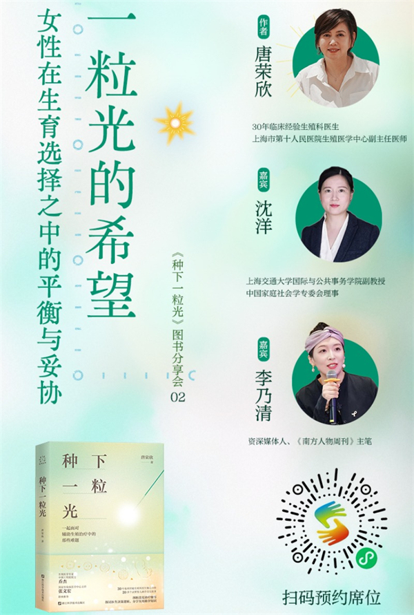 对许多女性而言,生育从来不是简单的“是”或“否”,而是一场漫长而隐秘的平衡——在个人理想与社会期待之间,在身体自主与血脉延续之间,在“此刻的我”与“可能成为母亲的我”之间。这份平衡的背后,是无数微小却沉重的妥协。这是属于这个时代的女性困境,也是人类延续千年的命题在个体身上的当代回响。10月25日下午,《种下一粒光》第二场线下图书分享会将于和平书院举行。届时,图书作者唐荣欣将亲临现场,上海交通大学国际与公共事务学院公共经济与社会政策系副教授沈洋、资深媒体人李乃清将作为嘉宾参与对谈。读者将有机会与医生、学者、媒体人面对面,共同开启一场关于生命、希望与爱的深度探讨。