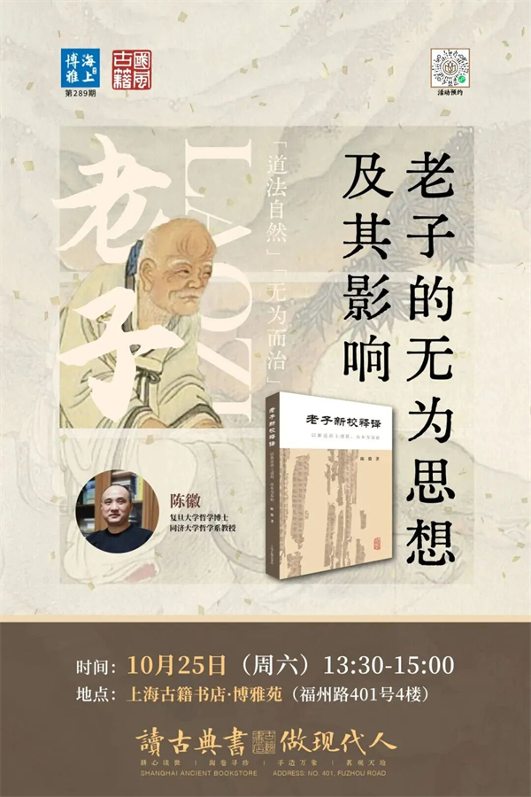 作为道家学派的创始人,老子对后世影响深远,“道法自然”“无为而治”等理念,早已融入我们的日常语言。然而,《老子》文本语言凝练、义理幽微,加之传世版本中存在诸多讹误,导致后人对其解读常有偏差。幸赖“地不爱宝”,多种《老子》出土文献相继问世,为人们窥见古本《老子》的原貌提供了可能。陈徽教授充分运用这些出土文献,以训诂与义理并重的方式,深入解读了“无为”概念的多重内涵、具体表现及其深远的思想影响。10月25日,他将做客上海古籍书店,为读者讲解老子的无为思想及其影响,启迪人生智慧。