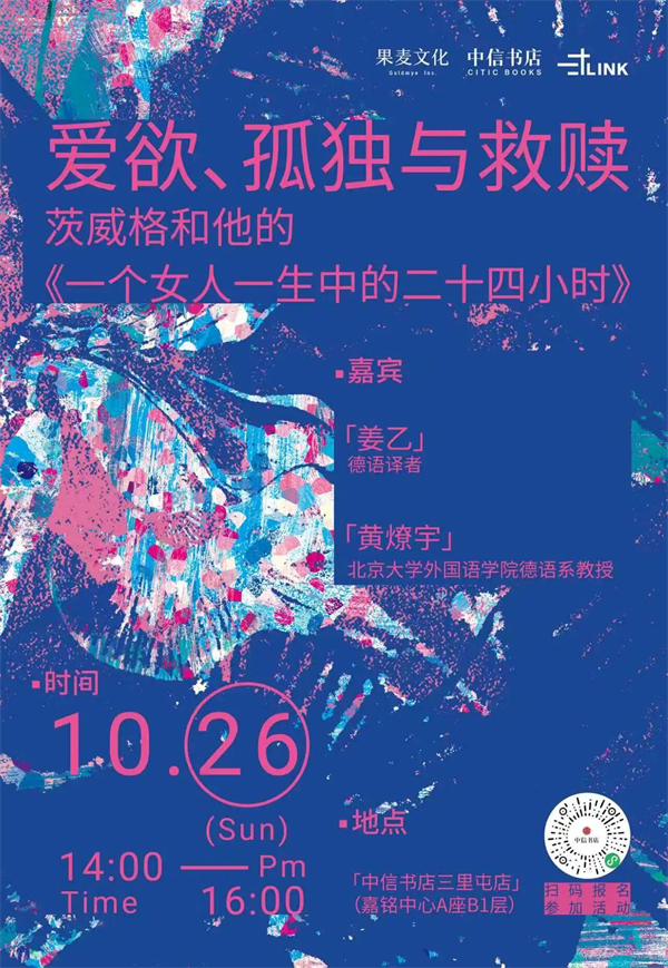 奥地利作家斯蒂芬·茨威格被称作“灵魂的猎手”,以细致入微的心理描写、曲折动人的情节与优雅的文笔,打动了国内外无数读者。《一个女人一生中的二十四小时》是茨威格最负盛名的小说之一,短短一日的故事,浓缩了一位女性一生的激情与悔恨。德语译者姜乙用优雅、精准、富于诗意的笔调,让这部被余华与高尔基高度赞誉的经典名篇在中文世界焕发新生。10月26日下午,我们将邀请姜乙与北京大学外国语学院德语系教授黄燎宇展开对谈——从德语文学的魅力,到女性的精神困境;从“美好年代”的迷梦,到当下的自我觉醒。