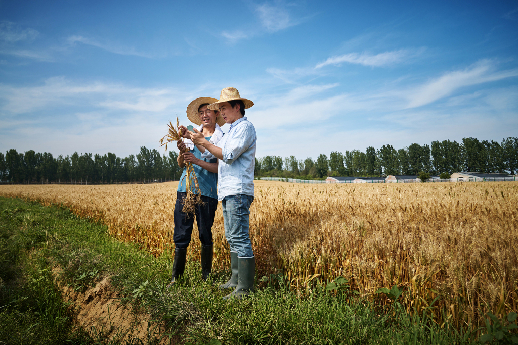 返乡青年和家人在麦田里交流种植技术。视觉中国 图
