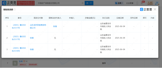 10月20日,据企查查提供的信息显示,青岛市市南区人民法院3次向张倩下发限消令,立案日期均为2025年6月4日。而自今年6月份以来,张倩已4次被法院列入被执行人,被执行总金额约2亿元(详见本报报道《华海财险一董事被立案执行约2亿元》)。