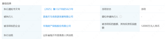 与此同时,天马岛旅游持有的华海财险1.2亿股权被临沂市莒南县人民法院冻结,这是该公司持有的全部华海财险股权。