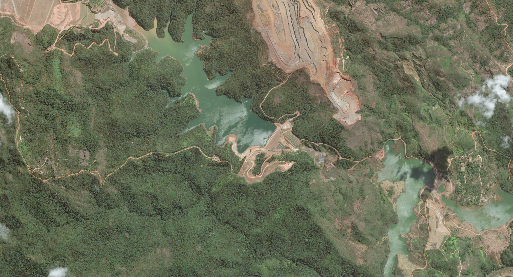 当地时间2025年8月25日,巴西杰尔马诺,Maxar卫星图像显示,杰尔马诺矿区的一座大坝结构被森林环绕,周围可见采矿区和开挖的土方。视觉中国 图