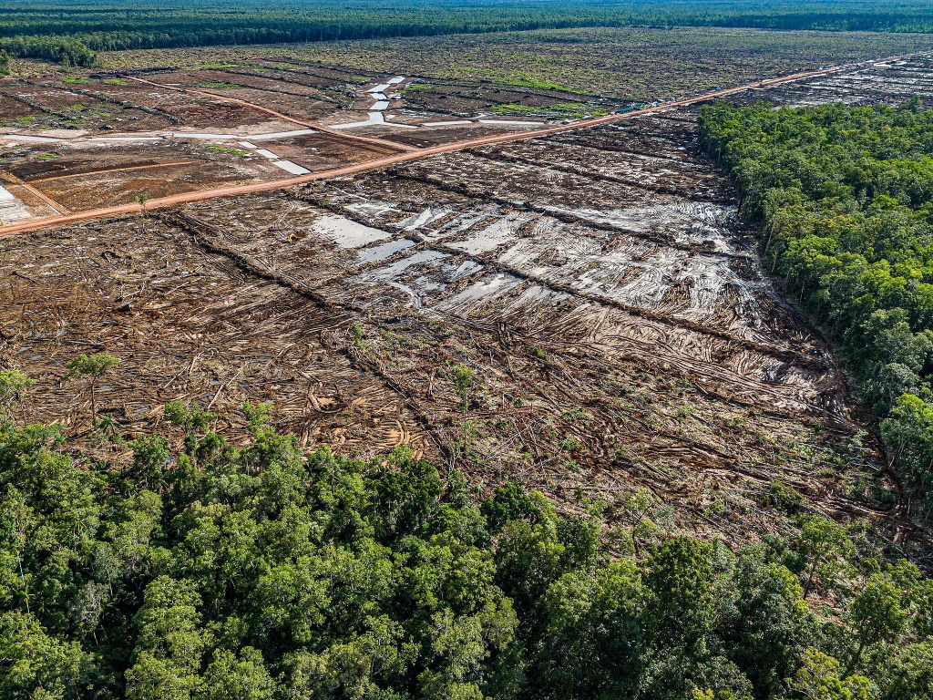 当地时间2025年3月17日,印度尼西亚南巴布亚省马劳克县,照片显示了一片被砍伐的区域,该区域将被改造成甘蔗种植园。视觉中国 图