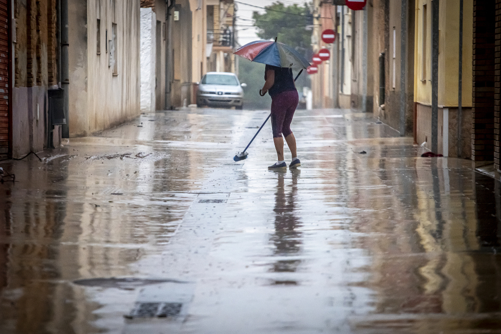 当地时间2025年10月13日,西班牙,强风暴“爱丽丝”袭击加泰罗尼亚南部,强降雨后,人们疏通受阻的街道。视觉中国 图