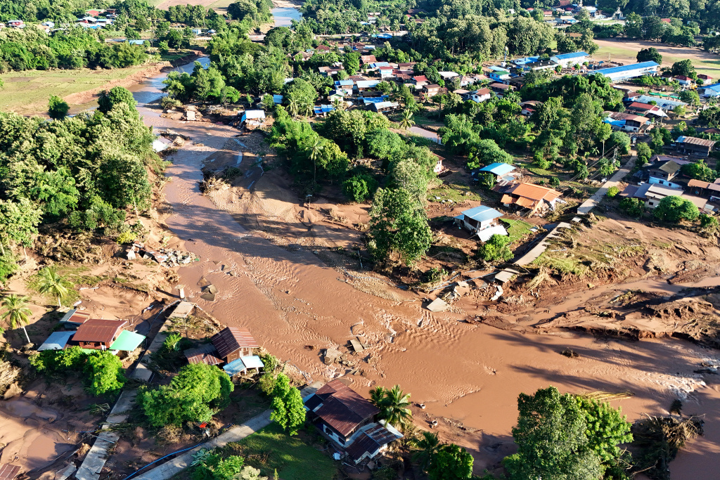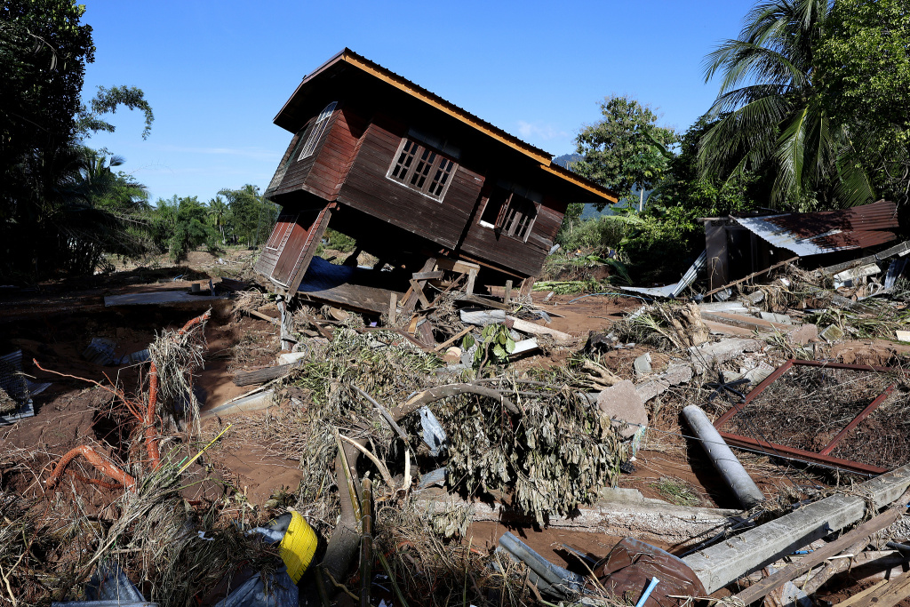 当地时间2025年10月3日,泰国程逸府,南帕特县一乡村遭受洪水袭击,房屋被毁。视觉中国 图
