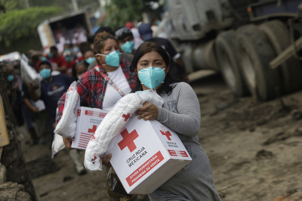当地时间2025年10月17日,墨西哥韦拉克鲁斯州波萨里卡,墨西哥红十字会成员向受洪水影响的民众提供人道主义援助。视觉中国 图