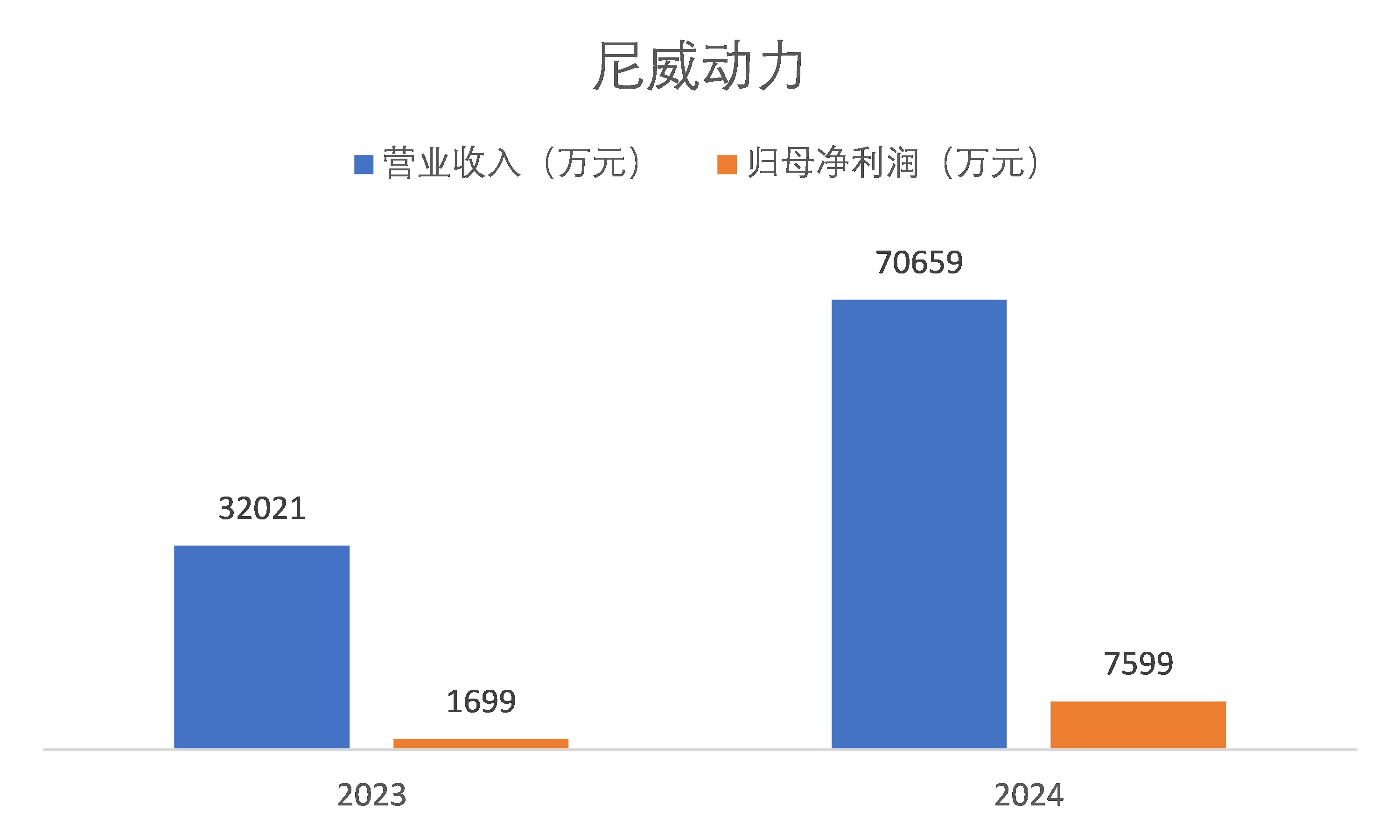 公开数据显示,尼威动力近三年业绩呈现爆发式增长:2023年营收3.2亿元,2024年营收翻倍至7.07亿元;净利润则从2023年的1699万元,跃升至2024年的7599万元。