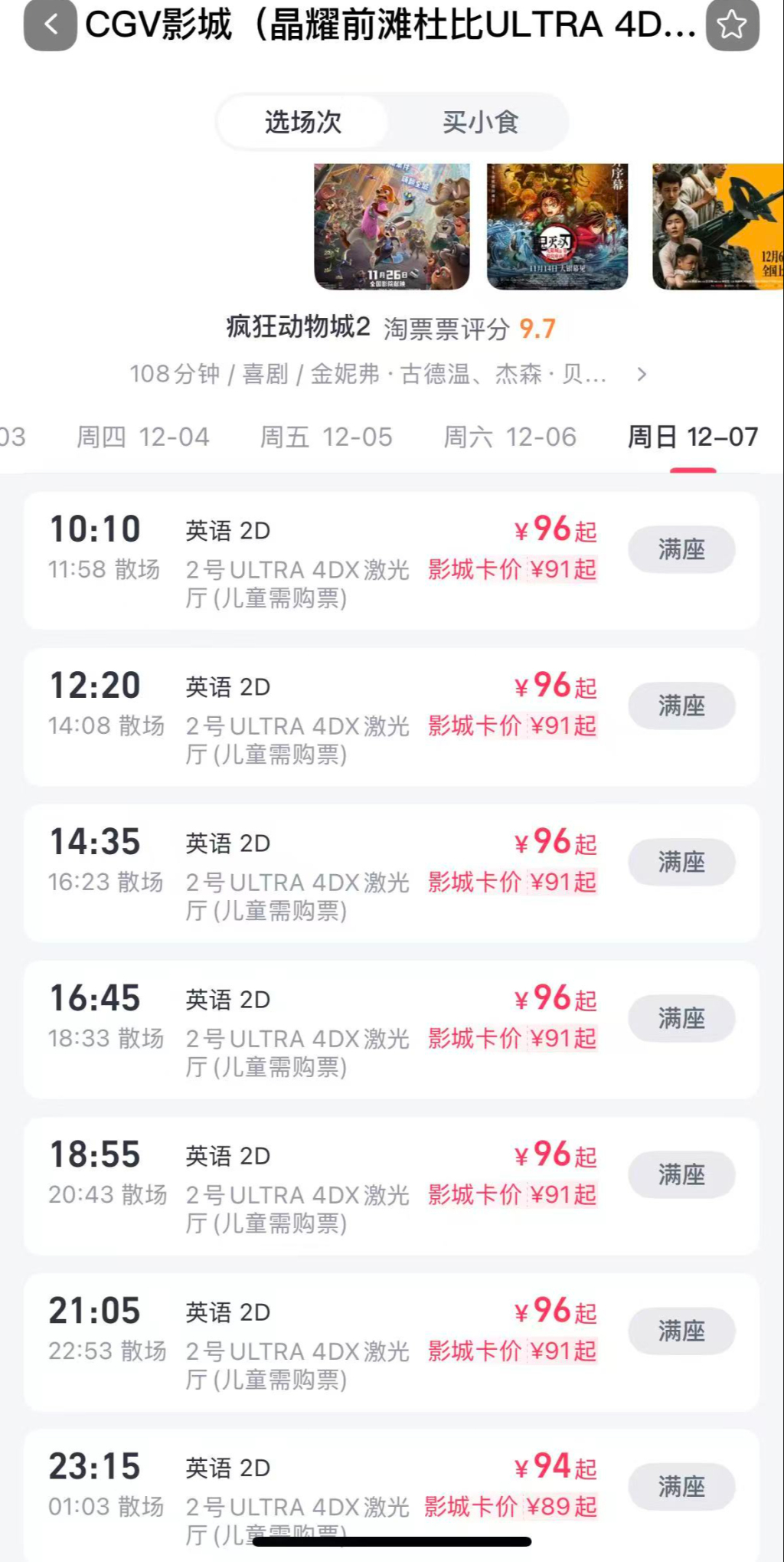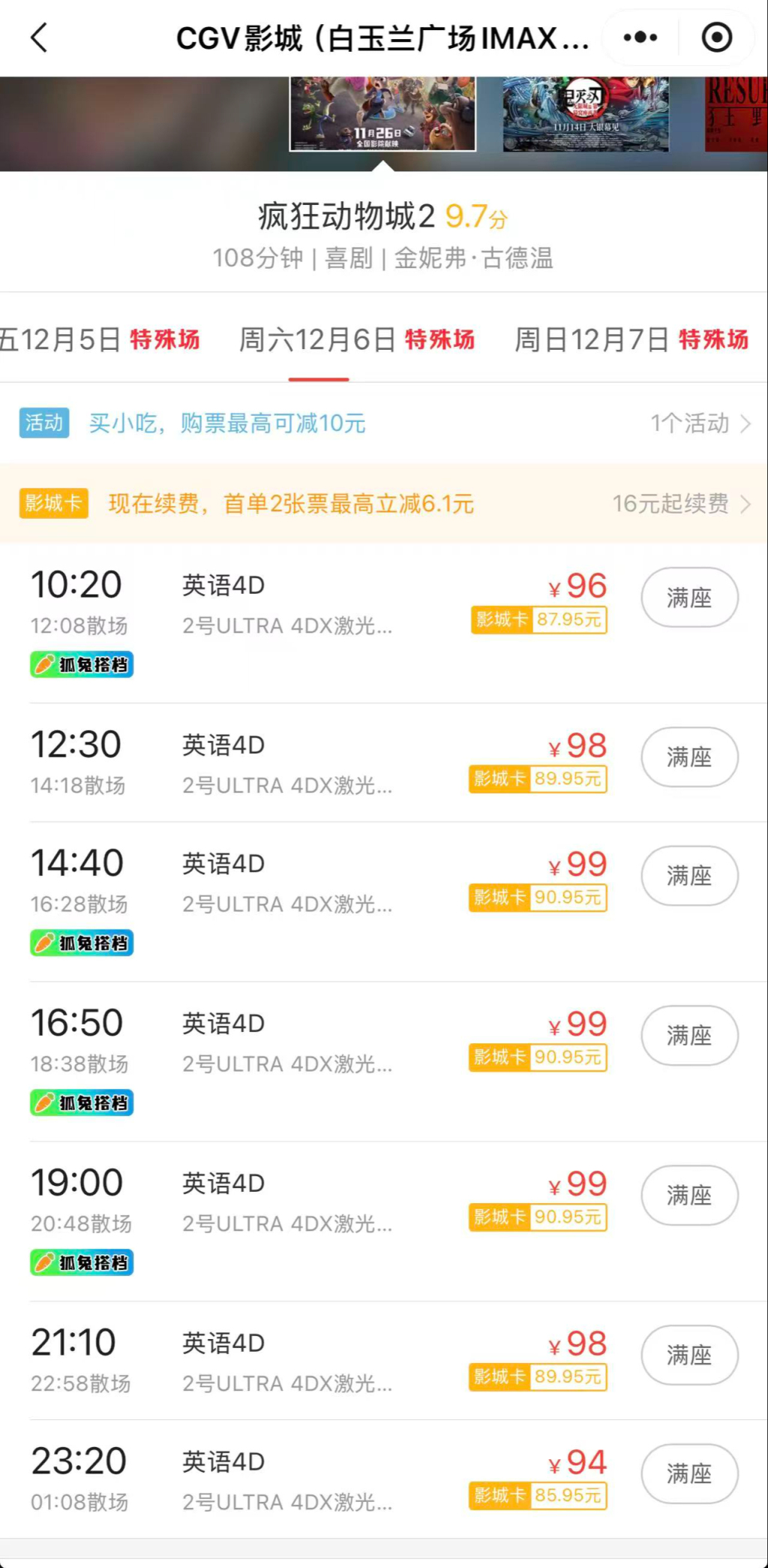 在上海的部分4DX激光厅,《疯狂动物城2》的周末场次一票难求。