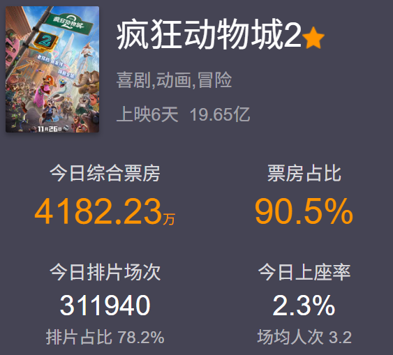 截至12月1日13时50分,《疯狂动物城2》的实时票房情况。数据来源:猫眼专业版