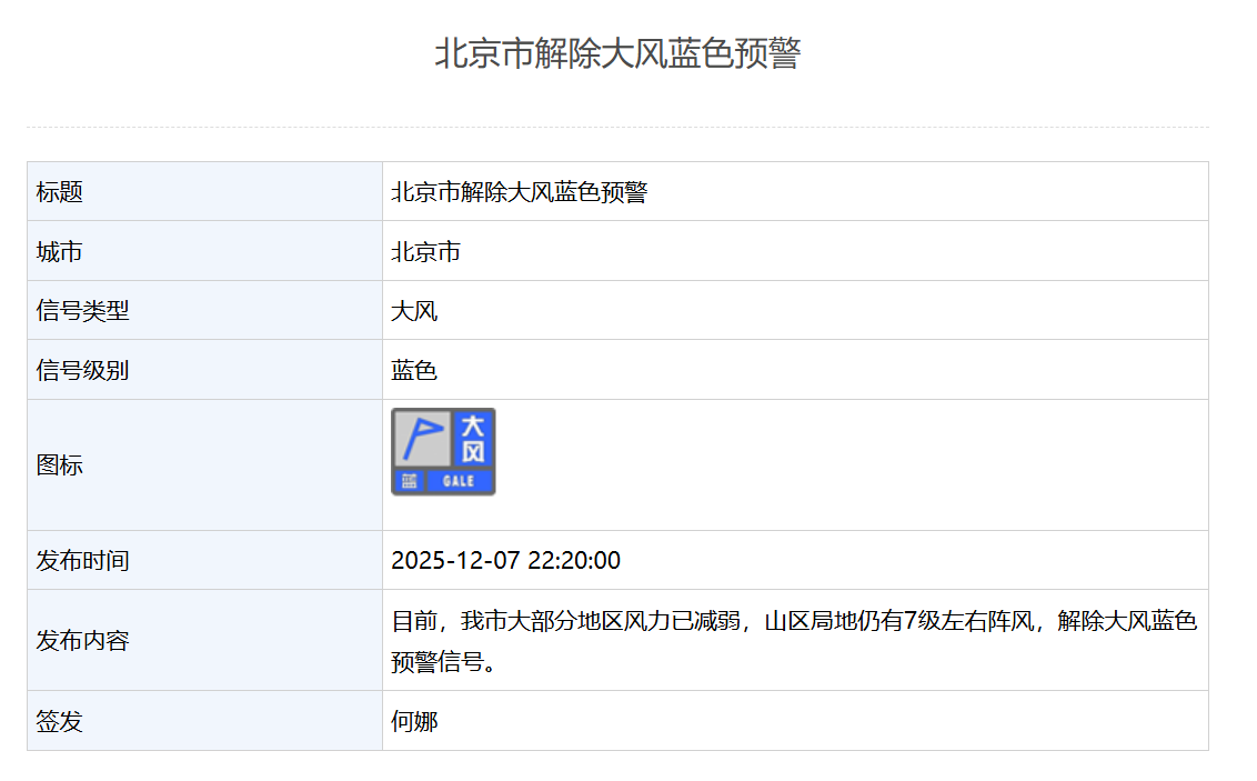 12月7日,据北京市气象局消息,目前,北京市大部分地区风力已减弱,山区局地仍有7级左右阵风,解除大风蓝色预警信号。