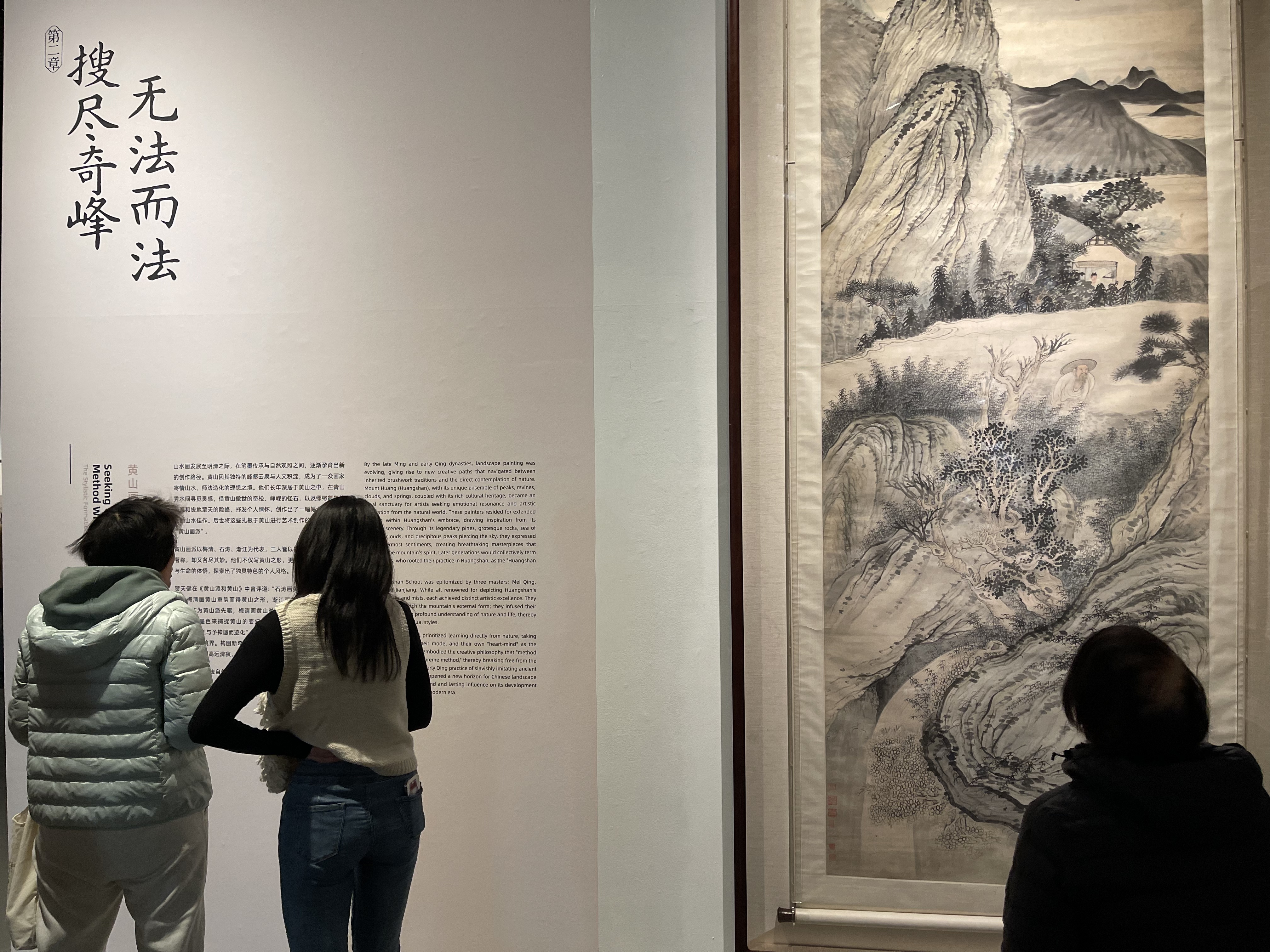 步入展厅,首先夺人眼目的是一幅高达3.5米的石涛山水巨制。丈二纸上,清初巨匠石涛笔下的黄山在氤氲墨气中拔地而起。奇峰以干湿并用的渴笔勾勒,苍劲有力;云海以淋漓的水墨烘染,空灵流动。这幅刘海粟美术馆珍藏的《黄山图》,其尺幅之宏大、笔意之纵横,不仅将黄山“无峰不石,无石不奇”的形貌尽收卷中,更以“搜尽奇峰打草稿”的创作宣言,定格了中国山水画从摹古到师造化的关键转折。站在这幅三百年前的巨作前,观者仿佛能听见石涛“笔墨当随时代”的呼声穿越时空。