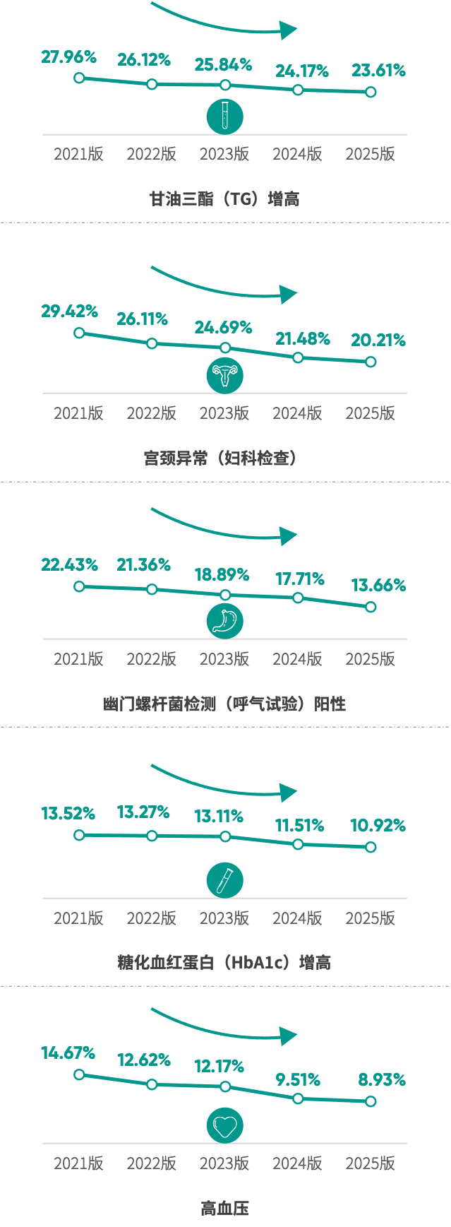 对比可见,前列腺异常(超声)、甲状腺结节(超声)、体重指数(BMI)增高和脂肪肝(超声)连续五年检出率均超过四成。此外,乳腺结节(超声)检出率连年走高;甘油三酯(TG)增高、宫颈异常(妇科检查)、幽门螺杆菌检测(呼气试验)阳性、糖化血红蛋白(HbA1c)增高和高血压连续五年检出率呈逐年下降趋势。建立健康的生活方式并合理用药将有助于这些异常指标的进一步改善。