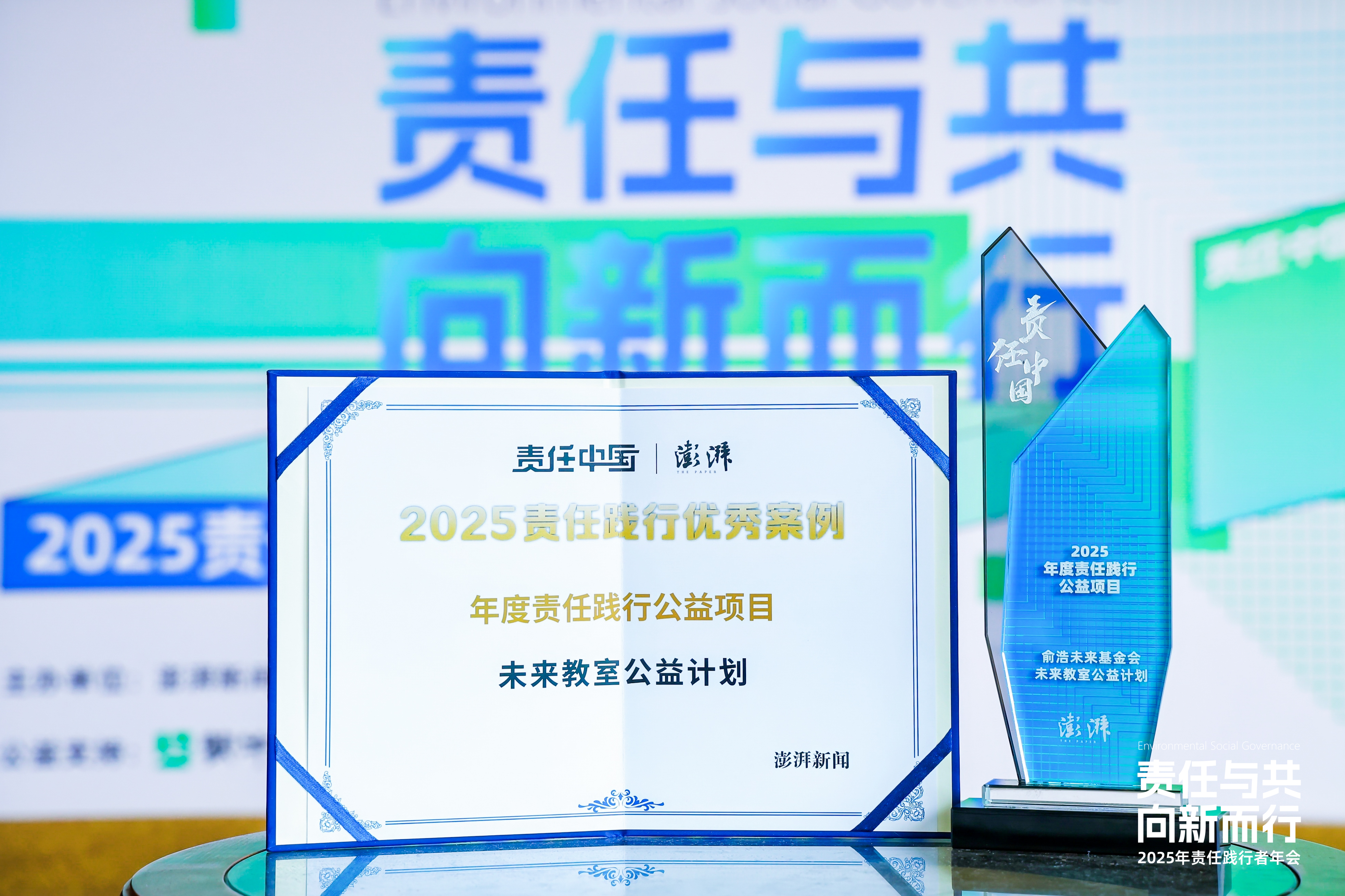 2025年12月10日,澎湃新闻成功举办了“责任与共 向新而行”2025责任践行者年会。在本届年会上,为发挥媒体的公信力和影响力,面向商业企业和公益机构征集了责任践行优秀案例。其中,“未来教室公益计划”项目荣获“年度责任践行公益项目”践行使命,回馈社会。俞浩未来基金会秉持高度的社会责任感,以科技教育为抓手,助力弥合城乡教育鸿沟,回应“乡村振兴”与“科教兴国”的时代命题,以切实行动为乡镇学校提供公正、优质的发展机遇,为国家高质量发展与可持续未来贡献力量。