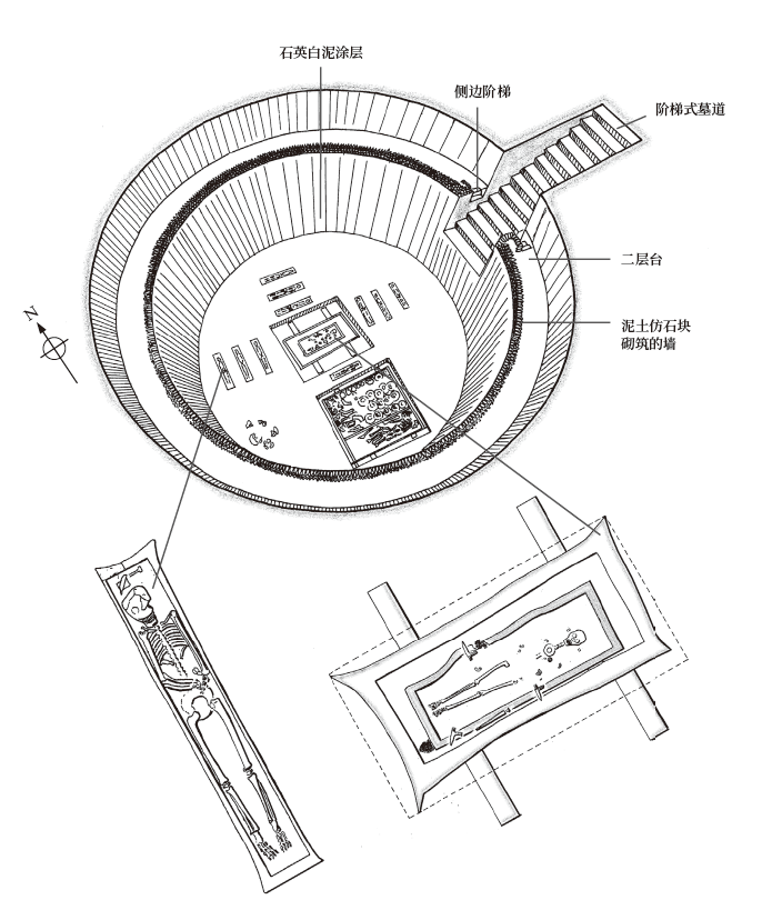 有一条坡道通往这圈平台,两侧叠有大量泥土仿制的石块,发掘者称之为“土偶”。在环形平台上方的填土上,先平整出了一个平坦的表面,又在周围设置了10多个馒头状小土丘。奇怪的是,泥土仿制的小石块又散布在填土中间。为了完成这座墓葬,在堆砌土墩之前,坑里填满了一层白土,并在上面用石英铺设了一层巨大的玉璧形垫层。对石头的痴迷令人震惊,尤其是陵墓建造者决定用泥土仿制石块。墓道有14级台阶,但并没有通往放置棺椁的墓坑底。迫切的问题是,如何设计这样一条墓道?它的目的是什么?中国核心区域仅存的另两座圆形陵墓属于钟离君柏的直系亲属——配偶和儿子。不幸的是,他儿子的墓葬已被严重盗扰,而他配偶的墓葬尚未被发掘。营建并居住在这座奇特来世宫殿的人,到底来自哪里?