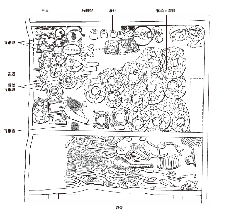 墓坑底部是钟离君柏的东西向棺椁。他并不是独自进入来世,这又和两周传统葬制截然不同。他的东、西、北三侧各被三副精心摆放的棺木围绕着,南侧只有一副,棺中是随葬的侍从(几乎可以肯定是殉葬)。柏的骨骼保存得不好,但一些牙齿告诉我们,他去世时约40岁。圆形墓穴和殉人棺表明,墓主人实力强大,并有独特的文化背景。在南侧棺旁边,一个几乎方形的木椁箱内装着随葬品,包括青铜器、陶器、编钟、编磬、武器和车辆配件。这也不是周墓的典型特征,在周墓中,如此丰富的随葬品会被放置在主棺椁周围的二层台上,武器或饰品等个人物品则会被直接放在墓主人身上。钟离君柏的器物箱似乎没有盖子,分为南北两个部分。刚才提到的随葬品在北箱,南箱则放着动物骨骸,这是另一个不同寻常的特征。墓坑的侧面很陡峭,向内倾斜的表面用白色石英做成白泥抹平装饰,这也是独一无二的。在这些侧壁上方、墓口以下2米处,又从侧面切出一个约1.8米宽的类似二层台结构,环绕着墓坑,这在其他地方也是从未见过的。