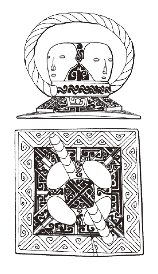 小青铜鼓座,8厘米×9厘米,四面人头像之下为简略的跪坐着的腿