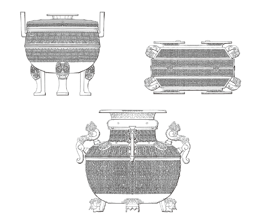 钟离君柏拥有一套五件青铜鼎,其中两件带盖,高37.1厘米;四件簠,高20.8厘米,宽36.8厘米;一对罍,高45.9厘米