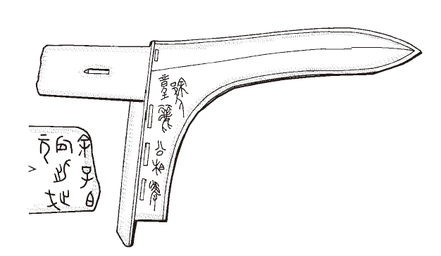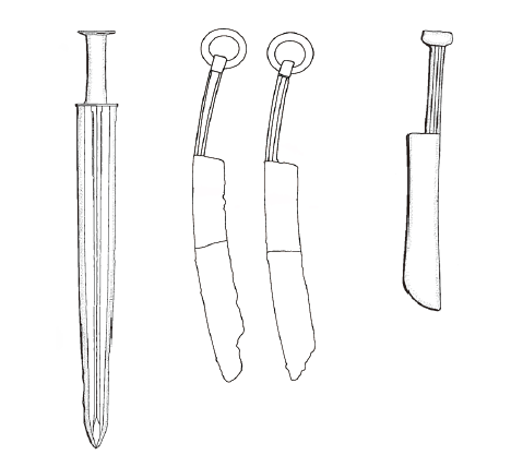 剑和单刃刀是当时广泛传播的地方习俗的很好例证。它们是北方牧民如阿尔赞草原贵族使用的典型武器。钟离君柏的青铜剑放在他的内棺边缘。其横截面显示,这是一种由经验丰富的工匠设计的复杂武器。在剑中央两侧,狭窄的刀刃之间有一根加厚的脊。像草原上的贵族一样,钟离君柏也有两把刀柄上带环的弯刀,这是公元前8世纪中原地区很常见的实用工具,在芮国和玉皇庙也有发现。刀柄上带圆环或方环的刀是欧亚草原的特色。对这些器物的偏好表明,草原上的习俗已经传播到整个中原和南方地区。当地也开发了一种小得多的刀,刀刃与刀柄的夹角更尖锐,钟离君柏10名殉人中的8名有这种刀。其中四副殉人棺中都有一件不寻常的椭圆形小容器,可能是磨刀器,上面有模印的图案。这种由高温陶切割而成的作品也出现在山东省的一座墓葬中,这揭示了一条从安徽经山东通往辽东的传播路线。由于这些刀很小,它们可能是象征性的,有些是在男性贵族的女性配偶的墓中发现的。钟离君柏的殉人中可能也有女性。