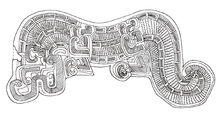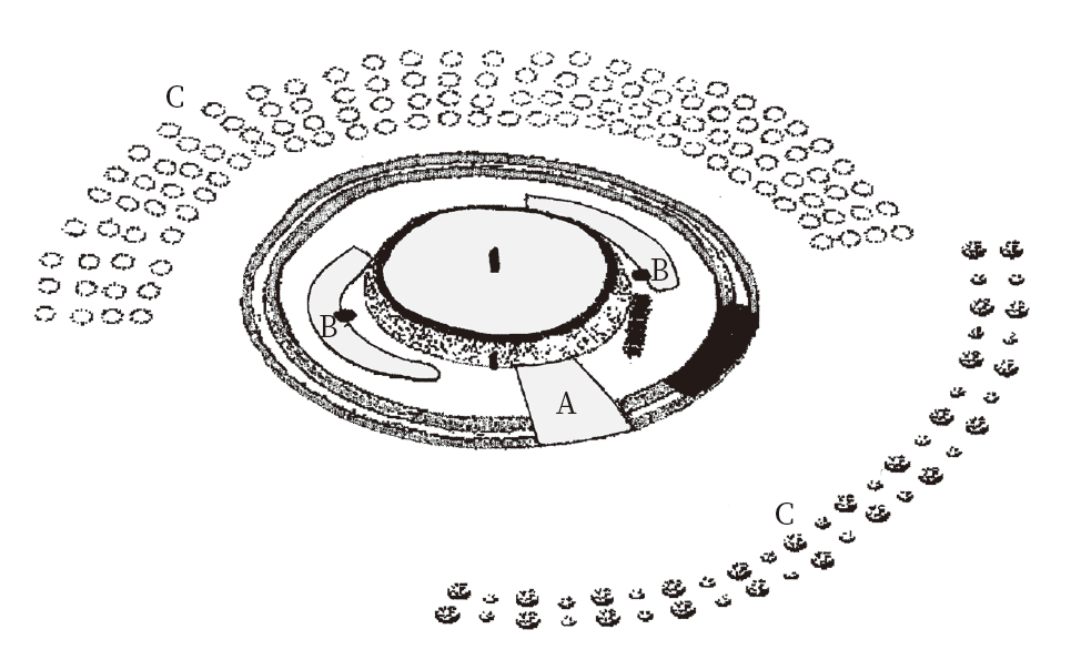位于西伯利亚的阿尔赞二号冢平面图,展示出葬礼参与者如何进入礼仪空间;A为主墓道,B为供哀悼者站立的泥土带,C表示外围小型陪葬墓和器物坑