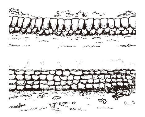 墓坑中所有11副陪葬棺形制都很特别:四角凸出,因此使四边的侧板略微向内弯曲。这可能是为了让人联想起一种在北方、黄土高原甚至更北的蒙古高原的墓葬类型。但是,陪葬棺和钟离君柏的器物箱是怎样被安置到如此深的墓坑里的?很可能是,随着陵墓建造者的挖掘,他们保留了用于移除泥土的坡道。一旦他们把钟离君柏的器物箱和殉葬棺放好,大部分坡道就被移除了,只留下一段从顶部切入墓墙的墓道台阶,穿过二层台,但并不通往墓坑底部。这些阶梯看起来像是施工过程中留下的特征。然而,我们需要检查二层台及其内侧周围的奇怪墙壁,以了解为什么需要阶梯式墓道。二层台很宽敞,相当于略微加宽了墓坑。其内缘有一道墙,这为我们提供了最重要的线索,用于判断这一葬制的起源及其墓主人的身份。这堵墙由尖顶圆体或方体的土坯垒成,土坯上有绳子捆绑的痕迹,当时应该是为了防止它们裂开。土坯的尖端朝向平台,平端朝向墓坑。发掘者称之为“土偶”,即模型或复制品。但这些术语并不能阐明它们的真正含义。这些牙齿状的长条泥块一定是石头的仿制品。从墓穴内部看,这道墙就像是石墙。这标志着墓坑的内部边界,可以防止平台上的人掉进墓坑里。坡道两侧有一些额外的台阶,人们可以由此走向墓坑方向并踏上平台,这里还设有方形转角,以免人滑入下面的空隙。即使墓坑已经被填土填满,这个平台也为参加葬礼的人提供了就近驻足的空间。我们就好像正在见证为这场葬礼所做的精心准备。人们可以走下台阶,来到二层台上,然后沿着平台找到自己的位置。一旦这一阶段的仪式结束,生者就可以离开,墓坑的全部以及二层台的空间就被填土填满。